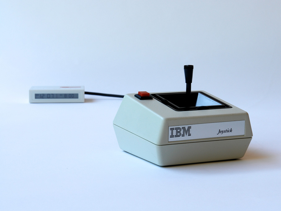 A fairly familiar joystick design for the IBM PCjr system. The IBM PCjr (read "PC junior") was IBM's first attempt to enter the market for relatively inexpensive educational and home-use personal computers. Two joystick ports were built into the PCjr, evidence of IBM's goal for marketing the PCjr as a home-friendly machine. Other than the Tandy 1000 and Amstrad IBM PC compatible lines a few years later, the dual built-in joystick ports introduced by the PCjr never became standard on IBM PC compatibles, and haven't been seen since. Also, in addition to the joystick ports having a different connector than used on the "game adapter" ISA card for PC compatibles, they required joysticks that had a different electrical resistance range in their X/Y access controllers, necessitating the use of PCjr-specific joysticks (or generic joysticks that had a dual-mode switch).