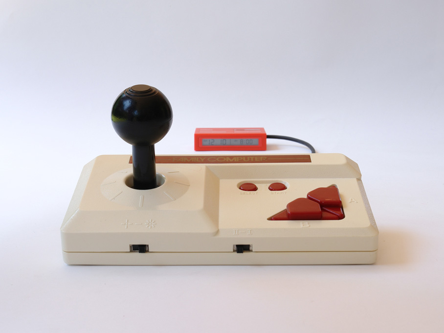 Famicom arcade stick manufactured by Hori. The stick is short but the grip ball is oversized and the A B fire buttons oddly arranged on the base. In comparison, the Start and Select buttons are round. The stick features a 4-way/8-way switch and a Player 1 or 2 slider. There are no extra buttons, no turbo.