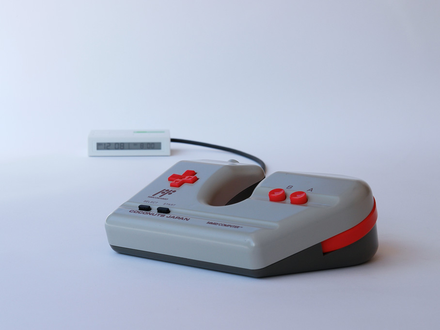 This is the Famicom pachinko controller by Coconuts Japan. The hook in the middle is an analog lever that simulates the dial on a pachinko machine. The controller has a odd size, a D-pad controller, and A, B, Start and select buttons. Pachinko is a Japanese gaming device used for amusement and gambling. A pachinko machine resembles a vertical pinball machine, but with no flippers and a large number of relatively small balls. The player fires a ball up into the machine, controlling only its initial speed. The ball then cascades down through a dense forest of pins. In most cases, the ball falls to the bottom and is lost, but if it instead goes into certain pockets, more balls are released as a jackpot.