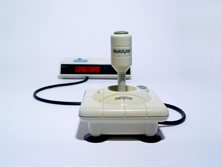 Spectra Video launched this Quickjoy joystick in 1993. The design features a smooth mechanical analog stick, an old-style top fire button and a wireframe looking design that resembles the graphics screen of a 3D modeling software. Time and alarm set up functions can be activated with the joystick.