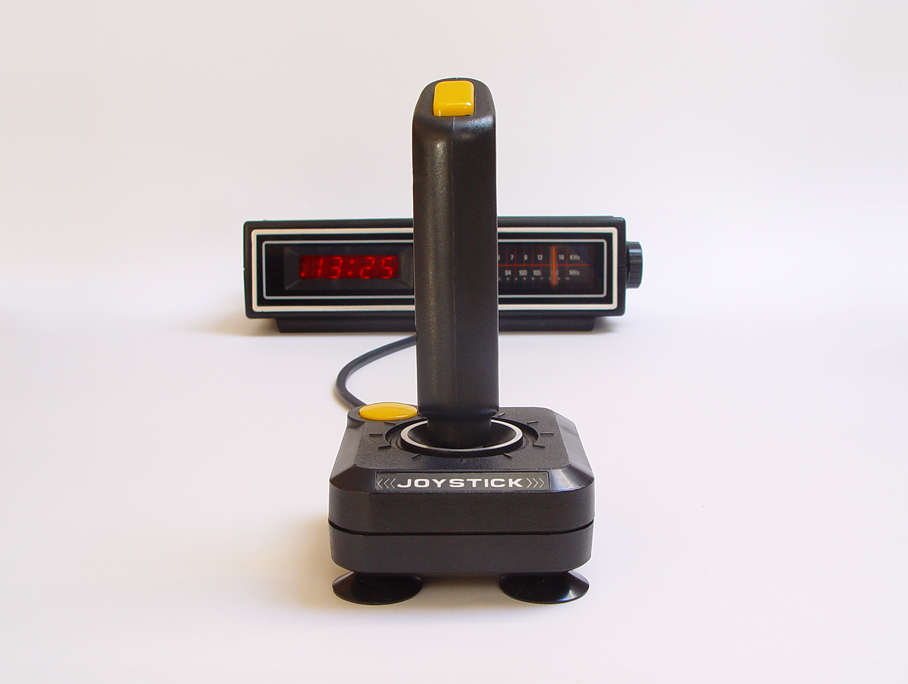 History of electronics is also a history of thousands of unbranded products which come to the market to sell hightly demanded items. Here two examples of no-name/bulk-label products: a clock radio in a wood decorated plastic box and a joystick compatible for most of the late 80s personal computers like Amiga, Sinclair, Commodore...