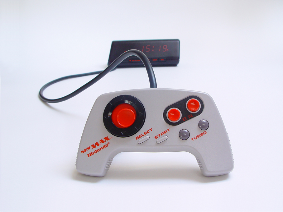 Designed as an alternative to Nintendo’s own original control pad, the MAX was one of the first ergonomic control pads built. The design is similar to the original Genesis control pad from Sega and meant to fit comfortably in the hand. The controller also had a unique analog-esque 360-degree directional pad (Nintendo called it “cycloid”). This classic controller pad is hard wired to a rare Philips alarm clock, prism Shaped and semi-transparent red plastic with few “designer” features like the alarm off button. Both devices, although technologically challenging, failed to succeed in the mass market. They belong to the rarity products subculture which is also interesting