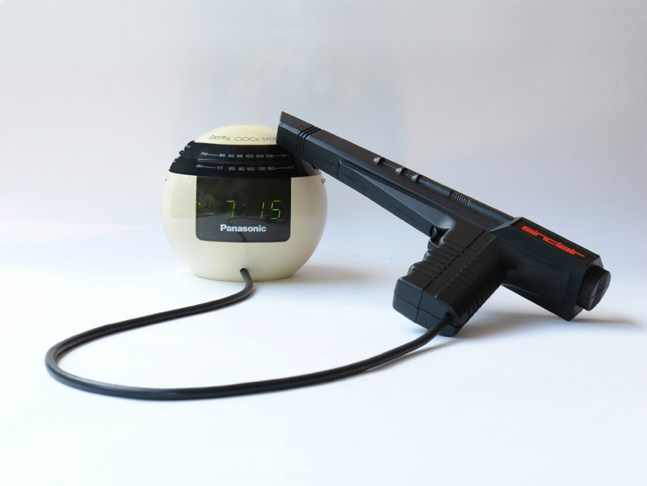 The Magnum Light Phaser is a light gun created in 1987 for the ZX Spectrum computer. It was Amstrad’s last peripheral for the video game console. The Magnum Light Phaser in many ways resembles the Light Phaser, the Sega Master System light gun, released in 1986. It was a Sinclair-branded Far Eastern product which was included in promotional bundles such as the “James Bond 007 Action Pack”, along with a small number of lightgun-compatible games. The light gun is hard wired to the coolest Alarm clock from the eighties: the ball-shaped, space age Panasonic.