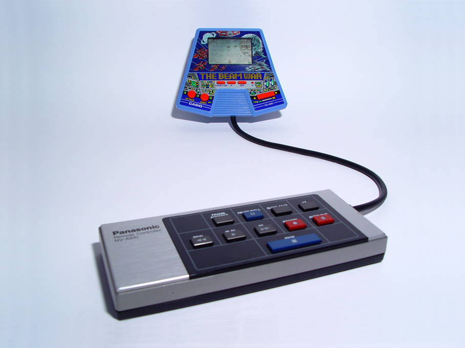 The Casio LCD games are good quality and they still work in the new millennium. The sounds can be fun, and the artwork is mostly great. A few different series were made, with crazy titles like “Funky Pierrot”, ”Astro chicken” and “Dandy cowboy”. This one is titled "The beam war" and is hard-wired to a robust and well designed professional audio remote controller from Panasonic.